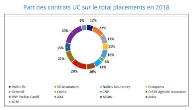 Par ailleurs, il est à noter que les acteurs Aviva, Axa, BNPP Cardif , Société Générale Assurances ont des taux de part UC > 20% par rapport au total de leurs placements financiers. Ces acteurs ont corrélativement un pourcentage élevé de leur activité en Assurance Vie > à 60%
